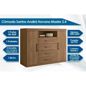 Todas as informações divulgadas são de responsabilidade exclusiva do fabricante/fornecedor. Tipo de Puxador: Puxador em ABS / PVC Garantia Legal de Fábrica CDC em Meses: 3 Possui Garantia Complementar de Fábrica após Prazo Legal?: Garantia de Fábrica Quantidade de Portas: 2 Portas de Abrir Quantidade de Gavetas: 4 Gavetas Quantidade de Prateleiras: 2 Quantidade de Nichos: 1 Nicho Com pillow top: Não É duplo pillow: Não É eco-friendly: Não Possui Memory Foam (Espuma Viscoelástica): Não É hipoalergênica: Não É antiácaros: Não Com base dividida: Não Este Produto Inclui Travesseiro: Não Com alta densidade: Não Tipo de Pintura: Ultravioleta Tipo de Acabamento da Pintura: Semi Brilho Possui Portas?: Sim Possui Nichos?: Sim Possui Prateleiras?: Sim Necessita Montagem?: Sim Acompanha Manual de Instalação e Montagem?: Sim É Lavável?: Não É resistente à água: Não Tipo de Produto: N/A Material de Estrutura: Estrutura 100% MDP Tipo de Dobradiças: Dobradiças Metálicas Tipo de Corrediça: c/ Corrediças Telescópicas Garantia: Garantia de 90 Dias Certificação de Qualidade: Qualidade Aprovada Quantidade de Cabideiros: 1 Cabideiro Montagem do Produto: Desmontável Material de Estrutura Fundo Gaveta: Em HDF Material das Prateleiras: Prateleiras em MDP Material das Portas: Portas em MDP Sistema de Montagem: Inclui kit de instalação Recomendações de Uso: Recomendações de Uso Tipo de Porta do Guarda-Roupa: Portas de Bater Espessura Material da Estrutura (mm): Espessura Mista 12mm / 15mm Estilo do Móvel: Clássico Forração do Revestimento: Tecido de Alta Qualidade Nossa Avaliação: Classificação de Qualidade Excelente Código universal de produto (GTIN): 7896659178541 Produto precisa de Montagem?: Sim, a montagem é simples mas sugerimos a contratação do nosso serviço de montagem (para os CEPs em que o serviço está disponível) ou de algum experiente de sua preferência Descrição do Tamanho: 99.00x:129.00x46.80 cm Estado de Origem: RJ País de origem: Nacional Peso Produto Com Embalagem (Kg): 48.85 Material para Filtro: N/I Cor Mobly: N/I Condição do Item: Numeral: 0 Não se Aplica: N/A Não Possui: Não Linha/Modelo: Santos Andirá Cor Cnova: Blush Cor Meli: Marrom Categoria - Sub: Cômoda de Quarto Categoria - Pai: Móveis de Quarto Comnto Embalagem: 46.80 Largura Embalagem: 129.00 Altura Embalagem: 99.00 Peso: 48.85 Kg Kit: 0 Peso Real Kg: 48.85 Peso Cubado: 24.18 Volumes: 1 M3: 0.10 Comnto/Profundidade: 47 cm Largura: 129 cm Altura: 99 cm Tamanho Montado: Larg:129.00 x Comp/Prof:46.80 x Alt: 99.00 Comnto/Profundidade Montado: 46.80 Largura Montado: 129.00 Altura Montado: 99.00 MPN: 309944 Cor Fabricante: Jatobá Marca: Santos Andirá Fabricante: Santos Andirá Linha: Santos Andirá