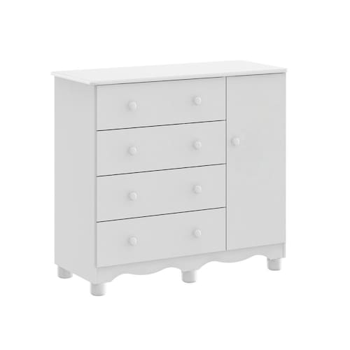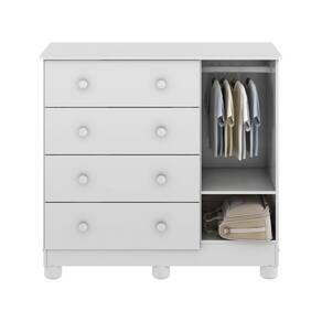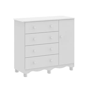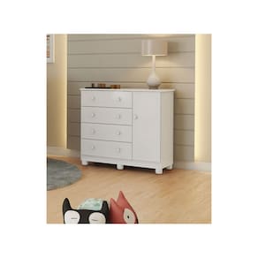 A Cômoda Júnior New 1 Porta é um produto 100% MDF e possui pintura atóxica. Sua estrutura é fabricada em chapa de 12 mm, sendo o seu tampo em chapa de 15 mm. Os pés são injetados em plástico de alta resistência. Possui puxadores plásticos, cabideiro metálico e corrediças apoiadas metálicas. Acompanha dois modelos de rodapés que podem ser definidos no momento da montagem.