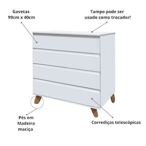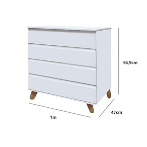 Cômoda com 1 metro de largura, e 4 gavetas, é uma cômoda grande, proporcionando um ótimo espaço para a organização do quarto do bebê. Cômoda branca que pode ser usada para quarto de bebê ou quarto infantil, versátil e durável. Produto Montado: Sim Acabamento da Gaveta: Pintura UV Acabamento dos Pés: Verniz Altura dos Pés: 10 Altura Máxima dos Pés: 10.0000 Ambiente Principal: Quarto de Bebê codigo_ean: 7895895185535 Complexidade da Montagem: Baixa: pode ser montado por uma pessoa sozinha Cor: Branco Cor do Produto: Branco Cor Interna: Branco Escala de Brilho: Fosco Escala de Brilho da Gaveta: Fosco Gaveta com Chave: Não Itens Inclusos: 1 Cômoda, Kit Ferragens e Manual de Montagem Linha ou Coleção: ninho Manual de Montagem e Instalação: https://product-hub-prd.madeiramadeira.com.br/878971/documents/f621369f-b97e-490b-9435-530c40e0c5411657493manual20683.pdf Material da Gaveta: MDF Material do Fundo: MDF Material dos Pés: Madeira Maciça Material Principal: MDF modular: Não Necessita Montagem: Sim Origem do Produto: Nacional Pés Reguláveis: Não Peso: 48 kg Peso Máximo por Gaveta: 3 kg Possui Espelho: Não Possui Nichos: Não Possui Pés: 04 Possui Portas: Não Possui Prateleiras: Não Possui Rodízio: Não Possui Trocador: Não Quantidade de Gavetas: 04 Gavetas Recomendações de Uso, Manutenção e Limpeza: Na limpeza não utilizar produtos químicos e abrasivos, usar apenas com pano umedecido Sapatas Niveladoras: Não Sistema de Montagem: Kit de ferragens Suporta Até (kg): 30 kg Tipo de Corrediça da Gaveta: Metálica Telescópica Tipo de Madeira Maciça dos Pés: Pinus Tipo de Puxador da Gaveta: Embutido Marca: Puppi