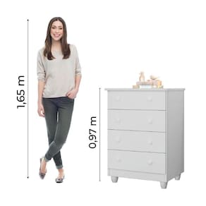 MEDIDAS:: A = 96,5 cm L = 65 cm P = 45 cm | ALTURA DOS PÉS:: 7cm | PESO:: 23,3Kg | PESO SUPORTADO:: 20Kg | GAVETAS SUPORTAM ATÉ:: 10Kg | NOME:: LARA | MARCA:: J&A Móveis | COR:: Branco | MATERIAL DA ESTRUTURA:: MDP | ESPESSURA DO MATERIAL DA ESTRUTURA:: 12mm | ACABAMENTO:: Pintura UV | GAVETAS: 4 | CORREDIÇAS:: Metálicas | PUXADORES:: Plástico | PÉS:: 4 | MATERIAL DOS PÉS:: Plástico | GARANTIA:: 3 meses | ITENS INCLUSOS:: 1 Cômoda Infantil, 1 Manual de Montagem, 1 Kit Parafusos | INSTRUÇÕES E CUIDADOS:: Para maior durabilidade, recomendável que a limpeza dos móveis seja feita com pano limpo e levemente umedecido em água e sabão neutro. Em seguida, deverá ser passado um pano limpo e seco. Cor: Branco