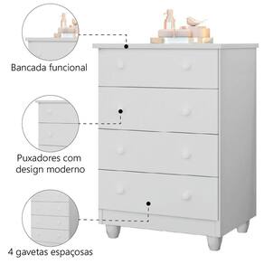 Transforme o Quarto do seu Bebê com a cômoda infantil Lara! Combinação ideal de estilo e funcionalidade. Conta com 4 gavetas com amplo espaço interno, para que as roupas e itens de seu bebê possam ser armazenados de forma ideal. A cômoda é funcional, pois sua bancada pode ser utilizada como fraldário, trazendo mais praticidade para o seu dia a dia. Confeccionado com materiais de qualidade garantindo maior durabilidade e resistência.
