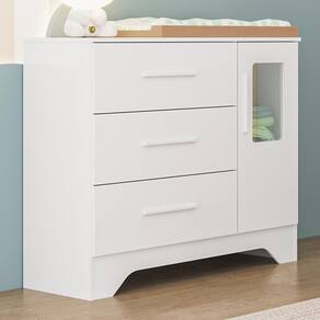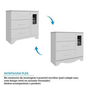 Cômoda Infantil Popy Retrô Plus 1 Porta com Janela e 3 Gavetas - Móveis Peroba A Cômoda Infantil Popy Retrô Plus une charme e funcionalidade em um design encantador. Produzida em MDF com pintura UV atóxica, conta com 1 porta com janela em PETG Cristal/Acrílico, prateleira interna e 3 gavetas com corrediças telescópicas, garantindo abertura suave e segura. Os puxadores em MDF revestido e as duas opções de rodapés (usinados ou retos) proporcionam versatilidade na decoração. Compacta e espaçosa, suporta até 4kg por gaveta. Ideal para organizar com estilo o quartinho do bebê.