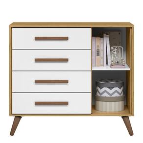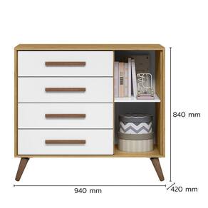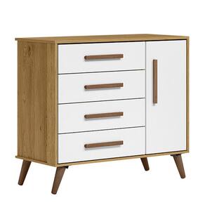 ESPECIFICAÇÕES: Estrutura MDP Pintura UV 1 Porta Dobradiças metálicas 1 Prateleira interna 4 Gavetas Corrediças metálicas Sistema antitombamento Puxadores em MDF Pés torneados em madeira de eucalipto design retrô Amplo espaço interno