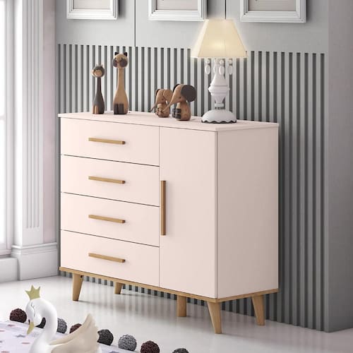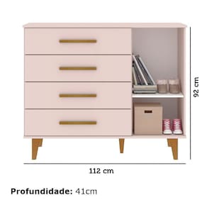 Um móvel leve e delicado em seu desenho, mas que oferece resistência e estabilidade em sua estrutura. No estilo retrô, a cômoda fraldário é fabricada em MDF e ainda conta com um sistema de anti-tombamento e corrediça telescópica nas gavetas. Este produto se encontra disponível nas cores Branco Fosco, Cinza Fosco e Rose Fosco.
