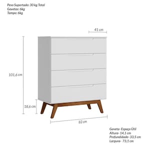 A Cômoda Retrô Sonhare possui um design com charme e elegância nas gavetas, com um detalhe usinado no MDF para servir como puxadores. Produzido em MDP e MDF de 15 mm, possui quatro gavetas com reforço interno e fundos embutidos para dar mais estrutura ao produto. Os pés são chassi deixando o produto robusto e com classe. Produto Montado: Sim Acabamento da Gaveta: Pintura UV Acabamento dos Pés: Verniz Altura dos Pés: 18.6 Altura Máxima dos Pés: 18.6000 Ambiente Principal: Quarto Infantil codigo_ean: 7909903468173 Complexidade da Montagem: Média: pode ser montado por mais de uma pessoa e/ou necessite de maior conhecimento para montagem Cor: Branco Cor do Produto: Branco Cor Flex: Não Cor Interna: Branco Escala de Brilho: Semi-Brilho Escala de Brilho da Gaveta: Semi-Brilho Gaveta com Chave: Não Itens Inclusos: 1 Cômoda, kit ferragens e manual de montagem Linha ou Coleção: Linha Manual de Especificação Técnica: https://product-hub-prd.madeiramadeira.com.br/874743/documents/28c9c04c-c0c0-4590-b7d2-5a6a2a4851c1242896manualexpcOmodaralpi.pdf Manual de Montagem e Instalação: https://product-hub-prd.madeiramadeira.com.br/874743/documents/80db0331-b46b-47ee-84b9-3a73d6b59512242902manualexpcOmodaralpi.pdf Material da Gaveta: MDF/MDP Material do Fundo: MDF Material dos Pés: Madeira Maciça Material Principal: MDP Montagem Flex: Não Necessita Montagem: Sim Origem do Produto: Nacional Pés Reguláveis: Não Peso: 40 kg Peso Máximo por Gaveta: 6 kg Possui Espelho: Não Possui Nichos: Não Possui Pés: 04 Possui Portas: Não Possui Prateleiras: Não Possui Rodízio: Não Quantidade de Gavetas: 04 Gavetas Recomendações de Uso, Manutenção e Limpeza: Pano úmido. Não aplicar lustra móveis. Sapatas Niveladoras: Não Sistema de Montagem: Minifix, parafusos, cavilhas, pregos Suporta Até (kg): 30 kg Tipo de Corrediça da Gaveta: Metálica Simples Tipo de Madeira Maciça dos Pés: Pinus Tipo de Puxador da Gaveta: Embutido Ean: 7909903468173