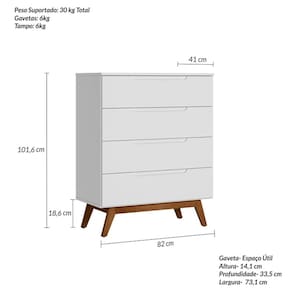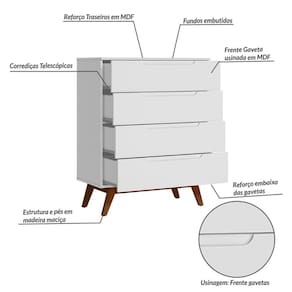 Cômoda Infantil Retrô 4 Gavetas Sonhare Branco. A Cômoda Retrô Sonhare possui um design com charme e elegância nas gavetas, com um detalhe usinado no MDF para servir como puxadores. Produzido em MDP e MDF de 15 mm, possui quatro gavetas com reforço interno e fundos embutidos para dar mais estrutura ao produto. Os pés são chassi deixando o produto robusto e com classe.