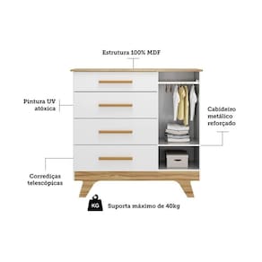Tipo de Cabideiro - Aéreo Material das Portas - Portas em MDF Tipo de Dobradiças - Dobradiças Metálicas Quantidade de Portas - 1 Porta de Abrir Material das Gavetas - Gavetas em MDF Tipo de Corrediça - c/ Corrediças Telescópicas Quantidade de Gavetas - 4 Gavetas Tipo dos Pés - ABS/PVC Quantidade de Pés - 6 pés Material das Prateleiras - Prateleiras em MDF Quantidade de Prateleiras - 1 Prateleira