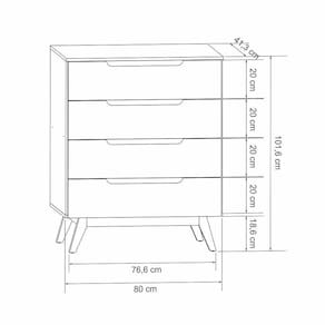 A Cômoda Retrô Alpi possui um design com charme e elegância, suas gavetas com um detalhe usinado no MDF para servir como puxadores. Produzido em MDP e MDF de 15 mm, possui quatro gavetas com reforço interno e fundos embutidos para dar mais estrutura ao produto. Os pés são chassi deixando o produto robusto e com classe.Tipo: Cômoda retrôModelo: AlpiCor: PretoMedidas (LXPXA):80CM X 41,3CM X 101,6CMCARACTERÍSTICAS:Acabamento: Pintura UVEscala de brilho: AcetinadoEstrutura: MDP E MDF 15MMPeso máximo suportado (kg): 30KGProduto necessita de montagem? SimQuantidade de pés: 4Tipo dos pés: Pés de pinusQuantidade de gavetas: 4Tipo de corrediça: MetálicaRecomendações de manutenção: Pano úmido. Não aplicar lustra móveis.Garantia: 3 mesesATENÇÃOIMAGENS MERAMENTE ILUSTRATIVAS REALIZADO EDIÇÃO, PODENDO HAVER UMA PEQUENA VARIAÇÃO DE COR DEPENDENDO DE CADA TELA OU MONITOR.CÃmoda Infantil Retrà com 4 Gavetas Alpi - Preto Acetinado