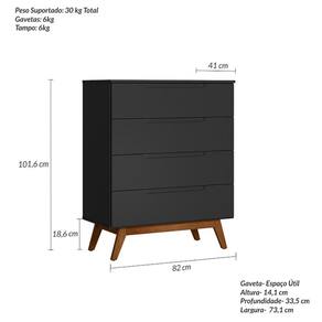 - Quantidade de Pés: 4 - Quantidade de Gaveta: 4 - Peso do Produto Montado: 40 - Peso Máximo Suportado: 30 - Medida do Produto Montado (LXCXA): 41cmx82cmx101,6cm - Tipo do Móvel: Cômoda - Acabamento: Pintura UV - Escala de Brilho: Acetinado - Material da Estrutura: MDF E MDP 15 mm - Produto Necessita de Montagem?: Sim - Tipo de Gaveta: Gavetas com reforço e corrediças deslizantes (roldana) - Tipo de Pés: Pés em madeira chassi envernizado - Tipo de Porta: Porta Rotativa - Recomendações de manutenção: Pano úmido. Não aplicar lustra móveis. - Volumes: 2 volumes - Garantia: 3 Meses