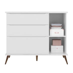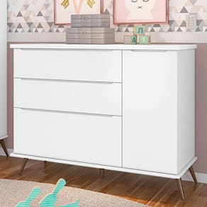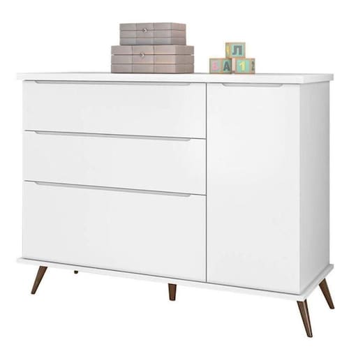 Cômoda Infantil Retrô Melinda 1 Porta E 3 Gavetas Branco - Phoenix Baby Branco Cômoda Infantil Retrô Melinda 1 Porta e 3 Gavetas - Phoenix Baby A Cômoda Infantil Retrô Melinda foi inspirada na decoração clássica, no intuito de trazer aconchego e elegância ao quarto. Ela possui 1 porta, 3 gavetas, cabideiro e uma prateleira, possibilitando organizar as roupinhas da melhor maneira possível. Um móvel para trazer beleza com o estilo retrô. ESPECIFICAÇÕES: - Estrutura em MDF - Pintura UV - 1 Porta - Dobradiças metálicas - 3 Gavetas - Corrediças telescópicas - 1 Cabideiro - Prateleira - Puxadores embutidos - Pés retrô em madeira de eucalipto