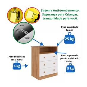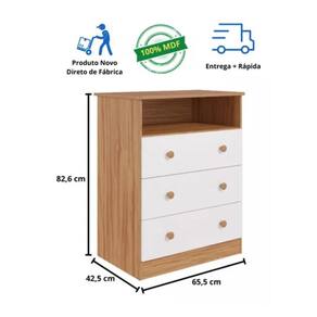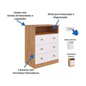 A Cômoda Infantil Smim da Peroba cor Branco com Amendoa referência 5238.87, com puxadores em ABS, corrediças telescópicas, bordas laqueadas e sistema antitombamento.Com um design moderno e prático, a cômoda é a escolha ideal para quem busca qualidade e durabilidade. Comum acabamento em branco com Amendoa que se adapta perfeitamente a qualquer decoração. Seu design clean não só embeleza o espaço, mas também proporciona uma sensação de amplitude. Com três gavetas espaçosas, você pode facilmente organizar roupas, brinquedos e acessórios, mantendo tudo ao alcance das mãos.Fabricada em 100% MDF, a Cômoda Smim oferece segurança e resistência, tornando-se uma escolha confiável para o quarto das crianças. O material é fácil de limpar e não possui arestas cortantes, garantindo um ambiente seguro para os pequenos exploradores.