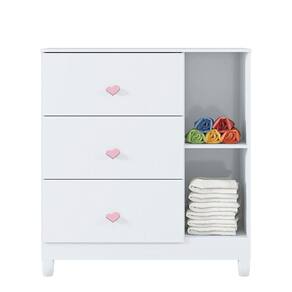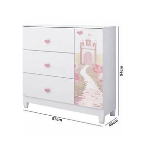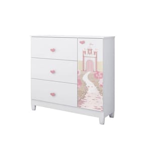 A Cômoda é um complemento muito utilizado nos quartos. A mamãe organiza com praticidade as roupas e acessórios para sua filha. Possui 1 Porta com dobradiças metálica e imagem de impressão digital que levam a criança a desenvolver sua imaginação vivenciando o mundo do castelo da princesa. 3 práticas gavetas com corrediças metálicas e puxadores temáticos coração. Pés em plástico resistente que facilita a limpeza.