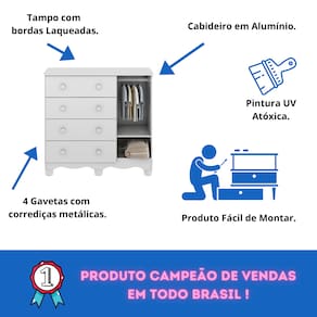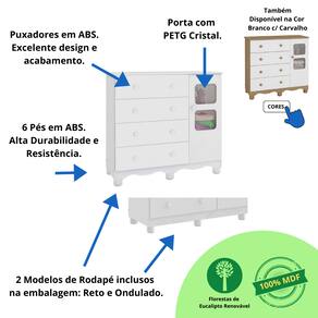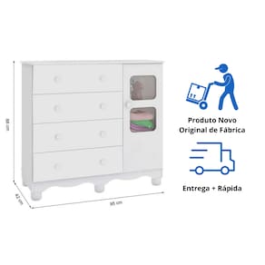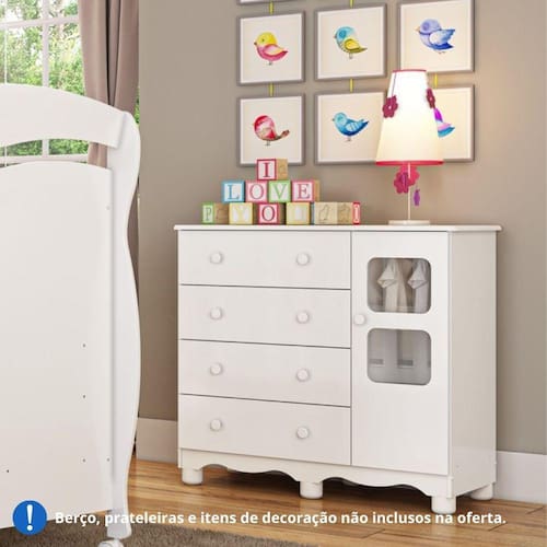 A Cômoda Uli é um produto que atende a diversos ambientes de sua casa, ideal para seu bebê, sua criança e até para uso adulto. Possui o tampo com bordas laqueadas e tem o diferencial do rodapé que pode ser montado no desenho reto ou com o rodapé ondulado. Altura: 88 cm;Largura: 95,3 cm;Profundidade: 42 cm;Quantidade de Gavetas: 04 Gavetas ( Peso suportado 4Kg);Quantidade de Portas: 01 Porta;Material: 100% MDF;Cores Disponíveis: Branco Brilho / Branco Brilho com Carvalho;Acabamento do Produto: Pintura UV Atóxica/ Pintura PU e Fita de Bordo;Acabamento das Portas: PETG Cristal ( Acrílico transparente );Tipo de Corrediça: Corrediça Metálica;Tipo de Cabideiro: Cabideiro Metálico;Tipo de Puxadores: Plásticos;Tipo de Pés: Plásticos ( Altura 6cm);Rodapé: 1 Reto e 1 Ondulado (Cliente escolhe na montagem);Embalagem: Peças envoltas em isomanta, caixa de papelão revestidas com plástico termoencolhível;Manual de Montagem: Manual segue na embalagem do produto;Perguntas Frequentes:A - É fácil montar a Cômoda Infantil Uli?Sim, é fácil. Ao abrir a embalagem pode parecer complicado, mas é só seguir o passo a passo no manual de montagem que você consegue!B - Qual guarda roupa / roupeiro combina com a Cômoda infantil Uli?Para ter mais beleza, estilo e praticidade no quarto do seu bebê, sugerimos completar sua coleção com o Roupeiro Infantil Uli. É só pesquisar aqui no site que você vai encontrar.C - Tenho a opção de comprar berço e cômoda juntos?Sim, só buscar aqui no site que vai encontrar nossa oferta.D - Qual a configuração da Cômoda Infantil Uli?É uma cômoda infantil com 4 gavetas e 1 porta.E - Como organizar a Cômoda infantil Uli?Você vai naturalmente encontrar a melhor maneira de organizar sua cômoda. Entretanto, vale a pena pontuar algumas situações:1-A cômoda deve estar sempre limpa;2-O Trocador (caso você tenha) pode ocupar bastante espaço no tampo da cômoda;3-Primeira Gaveta: Utilize para os produtos de Higiene do bebê;4-Demais Gavetas: Utilize para roupas e acessórios do bebê.F - Quais as cores disponíveis para a Cômoda Infantil Uli?Temos nas cores branca e branca com carvalho (marrom).G - Onde comprar a cômoda infantil Uli com segurança?Aqui é o site com o melhor preço e condições de entrega para você comprar.H - Onde é fabricada a Cômoda Infantil Uli?A Cômoda Infantil Uli é fabricada na cidade de Linhares-ES, pela Peroba Móveis Infantis.A Peroba é atualmente uma das maiores fábricas de Móveis Infantis da América Latina.Recomendações de Uso, Manutenção e Limpeza:Para limpeza utilize somente pano limpo e macio, ligeiramente umedecido em água (apenas o bastante para remover a poeira), seguido de um pano seco.