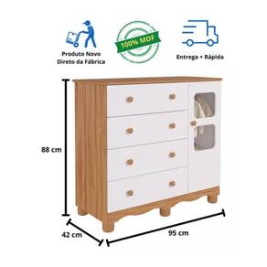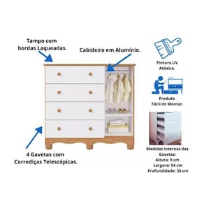 A Cômoda Infantil Uli da Peroba Cor Branco com Amendoa referência 5158.87, com porta com PETG cristal, puxadores em ABS, corrediças telescópicas, cabideiro metálico, tampo com bordas laqueadas, pés em ABS inclusos esistema antitombamento.Com um design moderno e elegante, é ideal para armazenar roupas, brinquedos e outros itens essenciais, garantindo que tudo esteja sempre à mão e em ordem. Seu design clean e moderno, aliado à cor branca com detalhes em amêndoa, cria uma atmosfera aconchegante e alegre. Com várias gavetas espaçosas, a cômoda proporciona uma solução eficiente para manter o quarto do seu filho sempre organizado. Além de facilitar o acesso a roupas e brinquedos, o design das gavetas permite que as crianças aprendam a manter seus pertences em ordem desde cedo, promovendo hábitos de organização.Fabricada em100% MDF, a Cômoda Infantil Uli é resistente e fácil de limpar, garantindo uma longa vida útil. A segurança é uma prioridade, e todos os materiais utilizados são livres de substâncias tóxicas, proporcionando um ambiente seguro para seu filho.