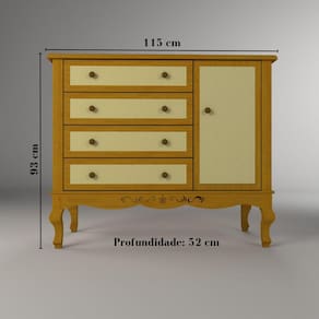 Móveis clássicos, trazendo o estilo provençal com muita sofisticação. Com design charmoso e arabescos entalhados, os móveis da linha Versailles deixam o quarto digno da realeza. A cômoda Versailles possui uma estrutura robusta e durável, pois utiliza 100% madeira maciça em sua fabricação. A sua base é reforçada, reforçando o aspecto clássico e dando maior durabilidade. O acabamento de alto padrão traz: pintura com verniz especial, aplicação de palha talagarça nas gavetas e porta e arabescos entalhados. Puxadores de metal. Possui corrediças telescópicas largas, de alta resistência. E dobradiças soft close, com fechamento com amortecimento. Acabamento da Gaveta: Verniz Acabamento da Porta: Verniz Acabamento da Prateleira: Melamínico Acabamento dos Pés: Verniz Altura dos Pés: 20 Ambiente Principal: Quarto Infantil Complexidade da Montagem: Alta: deve ser montado por um montador especializado Cor: Mel Cor do Produto: Mel Cor Interna: Marrom Escala de Brilho: Fosco Escala de Brilho da Gaveta: Fosco Escala de Brilho da Porta: Fosco Escala de Brilho da Prateleira: Fosco Gaveta com Chave: Não Itens Inclusos: 1 Cômoda, Kit Ferragens e Manual de Montagem Linha ou Coleção: Versailles Manual de Montagem e Instalação: https://cdn2.madeiramadeira.com.br/atributo/timber/1225846-manual-comoda-versailles-rev05.pdf Material da Gaveta: MDF Material da Porta: Madeira Maciça Material da Prateleira: MDF Material do Fundo: MDF Material do Puxador da Gaveta: Metal Material do Puxador da Porta: Metal Material dos Pés: Madeira Maciça Material Principal: Madeira Maciça Necessita Montagem: Sim Origem do Produto: Nacional Pés Reguláveis: Não Peso: 85 Peso Máximo por Gaveta: 5 Peso Máximo por Prateleira: 5 Possui Espelho: Não Possui Nichos: Não Possui Pés: 04 Possui Portas: 01 Possui Prateleiras: 01 Possui Trocador: Não Recomendações de Uso, Manutenção e Limpeza: Para higienização, utilizar um pano levemente umedecido. Sapatas Niveladoras: Não Sistema de Montagem: Parafusos, Minifix, Cavilhas. Suporta Até (kg): 60 Tipo de Corrediça da Gaveta: Metálica Telescópica Tipo de Dobradiça/Corrediça da Porta: Metálica Tipo de Madeira Maciça: Pinus Tipo de Madeira Maciça da Porta: Pinus Tipo de Madeira Maciça dos Pés: Pinus Tipo de Puxador da Gaveta: Externo Tipo de Puxador da Porta: Externo Marca: Timber