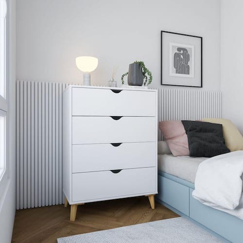 A cômoda Ipanema possui um visual dinâmico com 4 gavetas altas, adaptando-se para armazenar diversos itens da rotina. Com ótimo espaço de armazenamento e design marcante, ela se destaca em diversos projetos.