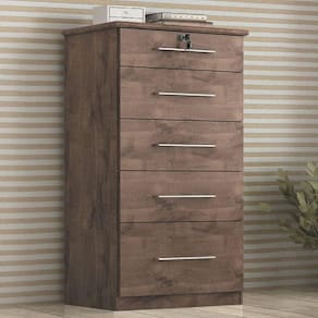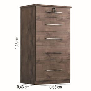 Marca: Quarta Divisão Material: MDP Largura (cm): 63,5 Altura (cm): 113 Profundidade (cm): 43,5 Acabamento: Pintura UV Cor: Chocolate Escala de Brilho: Fosco Quantidade de Portas: 0 Tipo de Abertura da porta: - Tipo de Puxadores: Madeira Quantidade de Gavetas: 5 Corrediças: Metálicas Peso Suportado por Gaveta: 5kg Possui Prateleiras: 0 Necessita de Montagem: Sim Possui Pés: Não Incluso Pés Garantia: 3 meses Recomendações de Uso, Manutenção e Limpeza: Para começar a limpeza, retire o pó com flanela seca, depois use um pano macio, levemente umedecido com água. É possível o uso detergente neutro, ou sabão neutro com água .