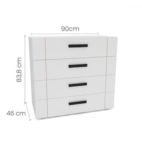 O(a) Cômoda Lisboa 4 Gavetas Branco - Politorno é produzido em MDF e MDP na escala de brilho Semi-Fosco, e possui um grau de dificuldade de montagem: Médio.