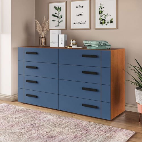 O(a) Cômoda Lisboa 8 Gavetas Freijó/Azul - Politorno é produzido em MDF e MDP na escala de brilho Semi-Fosco, e possui um grau de dificuldade de montagem: Médio.