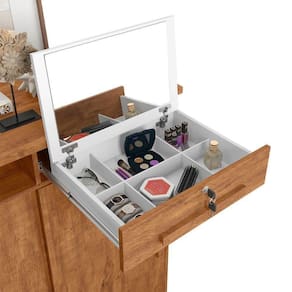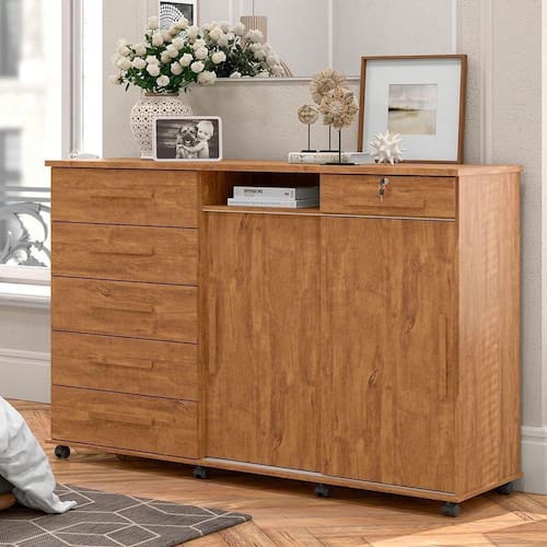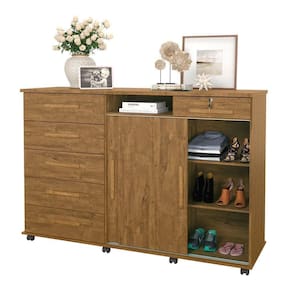 Cômoda Madeira 6 Gavetas Rodizios Amêndoa Max New Lukaliam Amêndoa A cômoda Max New Lukaliam é perfeita para sua casa. Além de decorativa, ela possui bastante espaço interno para auxiliar você na organização do seu ambiente. Ela tem 2 portas reversíveis capazes de mudarem de posição e que permitem a acomodação da cômoda para quarto de acordo com o layout do seu espaço. As 6 gavetas com corrediças telescópicas e sistema de travamento revelam um espaço ideal para você organizar seus objetos com mais comodidade. A gaveta com chave dessa cômoda de madeira traz mais segurança e proteção, além de revelar um espelho interno capaz de deixar seu ambiente com mais charme e versatilidade para as tarefas do dia a dia como se maquiar e conferir o visual. As prateleiras da cômoda gaveteiro oferecem a oportunidade de organizar seus utensílios com mais praticidade. Os pés em rodízio ajudam na locomoção da cômoda espelhada e o tampo em MDP de 25mm é resistente e próprio para você dispor seus objetos e itens decorativos. O cabideiro e o trilho em alumínio são resistentes e fáceis de usar, trazendo a praticidade para o seu dia. Os puxadores em madeira MDF favorecem a elegância e deixam esse produto mais bonito e inovador. A estrutura em madeira MDP é resistente e preparada com um material capaz de fornecer o acabamento perfeito e durável, isso sem contar a pintura com acabamento em fosco que deixa essa cômoda moderna perfeita para compor o seu dormitório. Cor: Amendoa Cor: Amêndoa