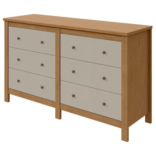 gavetas e costas em HDF. Vantagens/Benefícios: Produzido com equipamentos de alta tecnologia; Produto avaliado e aprovado por um rigoroso controle de qualidade; Fácil montagem e manual de montagem simplificado; Design minimalista com um toque vintage; Acabamento com toque aveludado; Gavetas ideais para acomodação das roupas em maiores quantidades; Gavetas grandes e espaçosas com corrediças telescópicas; Tampo de 25mm para maior resistência; Pés robustos que garantem maior estabilidade. Aliada da organização do seu dormitório, a Cômoda Maggiore é a peça que falta para garantir um dia a dia mais otimizado e um ambiente bem decorado. Pode ser uma grande aliada do guarda-roupa, reservando-se para as peças menores e dobráveis, mas também pode ser usada sozinha para deixar tudo sempre à mão. COR: AMÊNDOA CLEAN/OFF WHITE