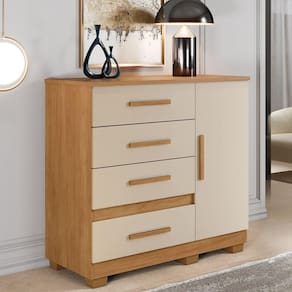 Cômoda Melissa 4 Gavetas 1 Porta Com Sapateira - Benetil Cinamomo Off A Comoda Melissa com seu lindo design traz charme e elegancia a qualquer espaco, contem 1 porta e 1 prateleira para acomodar seus acessorios, alem de possuir 4 gavetas com corredicas telescopicas que proporcionam uma maior suavidade em seu uso, ideal para pequenos espacos. Sua fabricacao utiliza a linha mdp perffect 15 mm, que une a sustentabilidade a inovacao tecnologica, proporcionando durabilidade e facil limpeza; inspirando sofisticacao ao mobiliario. A Comoda Melissa possui pintura UV que conta com boa resistencia, e facil de limpar e e ecologicamente correto, pois utiliza madeira de reflorestamento, evitando o desmatamento. Caracteristicas: Material principal: MDP Espessura das chapas: 15 mm Escala de brilho: semi fosco Acabamento: Pintura UV Sistema de montagem: parafuso, cavilha e cantoneiras metalicas Quantidade de Gavetas: 4 Quantidade de Portas: 1