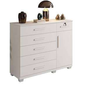 Cômoda Milão 6 Gavetas 1 Porta 1 Prateleira Com Sapateira Branco A Comoda Milao e uma peca robusta, confeccionada em chapa de 15 mm, que garante maior durabilidade e resistencia. Ela possui uma porta, uma prateleira e seis gavetas, sendo uma delas com chave para seguranca adicional. As corredicas telescopicas oferecem um funcionamento suave e eficiente. O produto vem com pes inclusos e puxadores na cor, proporcionando um otimo custo-beneficio. Com a tecnologia MDP Perfect, a comoda combina sustentabilidade e inovacao, assegurando facil limpeza e durabilidade. Sua pintura UV e resistente e de facil manutencao, alem de ser ecologicamente correta, utilizando madeira de reflorestamento e contribuindo para a preservacao ambiental. Uma escolha elegante e consciente para o seu espaco. Caracteristicas: Material Principal Mdp Espessura Da Chapa: 15 Mm Escala De Brilho: Semi Brilho Acabamento: Pintura UV Sistema De Montagem: Parafuso, Cavilha E Cantoneiras Metalicas Quantidade de Portas: 01 Quantidade de Prateleiras: 01 Quantidade de Gavetas: 06