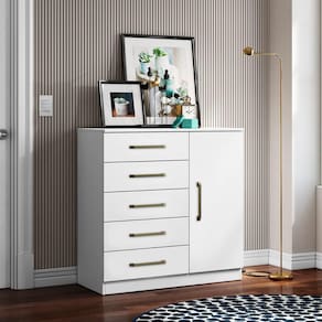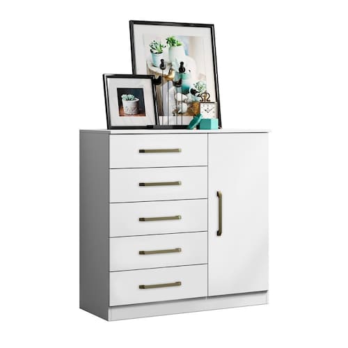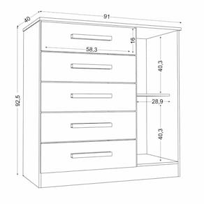 Prática e elegante, oferece 5 gavetas espaçosas com corrediças telescópicas e 1 porta para organizar roupas e acessórios com facilidade.