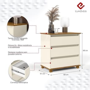 Cômoda Mini EJ Versátil 3 Gavetas com Pés de Madeira