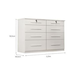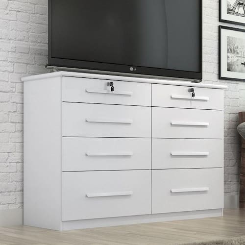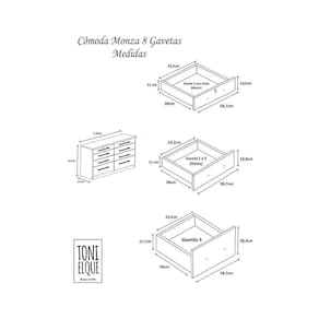 COMODA MONZA| Com 8 gavetas dispõe de um design sofisticado é própria para pessoas exigentes com organização. Possui um acabamento arredondado no tampo de 25 mm que enobrece o produto e o deixa mais resistente e belo. As gavetas tem corrediças metálicas o que facilitam a montagem. Suporta pesos de até 7kg em suas gavetas e 20kg no tampo suficiente para acomodar televisores. As gavetas possuem tamanhos diferentes sendo as primeiras com chave, as do meio gavetas medias e as ultimas gavetões. Logo, essa cômoda é ideal para guardar roupas, meias, cuecas e objetos pessoais com privacidade.