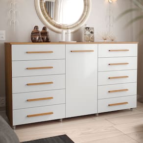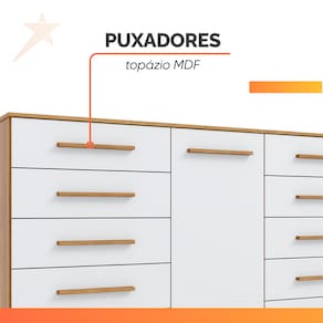 Com design moderno e elegante, a cômoda multiuso Ferrari é a combinação perfeita entre funcionalidade e estilo. Possui 10 gavetas espaçosas e 1 porta com prateleira interna, oferecendo amplo espaço para organização e armazenamento de roupas, acessórios e outros itens pessoais. As gavetas com corrediças telescópicas garantem um deslizamento suave e silencioso, enquanto as dobradiças de pressão proporcionam praticidade e segurança ao abrir e fechar as portas. Além disso, os rodízios em silicone facilitam a movimentação do móvel, permitindo mudar sua posição com facilidade sem danificar o piso. A pintura UV de alta qualidade oferece um acabamento duradouro e resistente, garantindo que a cômoda mantenha sua aparência impecável por muito mais tempo. Ideal para quem busca sofisticação e praticidade no ambiente, essa cômoda é uma excelente escolha para quartos, closets ou espaços multifuncionais.