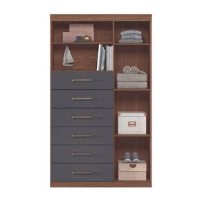 Possui uma porta com três prateleiras. Feita em MDP, contém seis amplas gavetas com corrediças telescópicas para guarda suas roupas com muita organização.