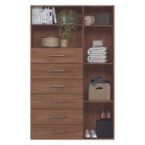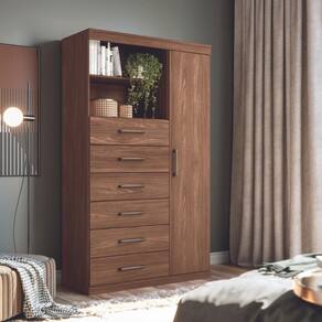 Possui uma porta com três prateleiras. Feita em MDP, contém seis amplas gavetas com corrediças telescópicas para guarda suas roupas com muita organização.