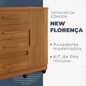 Quer um movel para deixar seu quarto mais pratico e funcional? A Comoda Florenca e perfeita para voce. Possui quatro gavetas com excelente profundidade e espaco interno. As gavetas com corredica telescopica proporcionam maior abertura e melhor aproveitamento do espaco. E fabricada com materiais de alta qualidade, oferecendo mais firmeza e durabilidade. Alem disso, tem uma porta que auxilia na organizacao e armazenamento dos objetos. Os puxadores sao madeirados, proporcionando um otimo acabamento ao movel.