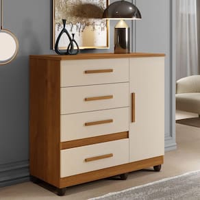 Quer um móvel para deixar seu quarto mais prático e funcional? A Cômoda Florença é perfeita para você. Possui quatro gavetas com excelente profundidade e espaço interno. As gavetas com corrediça telescópica proporcionam maior abertura e melhor aproveitamento do espaço. É fabricada com materiais de alta qualidade, oferecendo mais firmeza e durabilidade. Além disso, tem uma porta que auxilia na organização e armazenamento dos objetos. Os puxadores são madeirados, proporcionando um ótimo acabamento ao móvel.