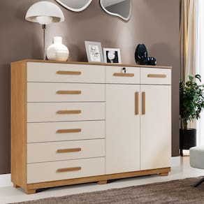 A Comoda Benetil New Triunfo e perfeita para quem busca organizacao, seguranca e design moderno. Com 8 gavetas espacosas sendo 1 com chave, voce mantem seus pertences seguros e seu quarto bem organizado.