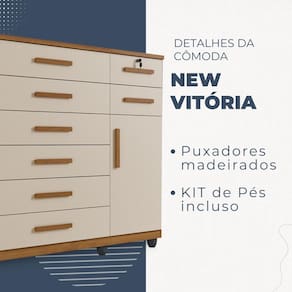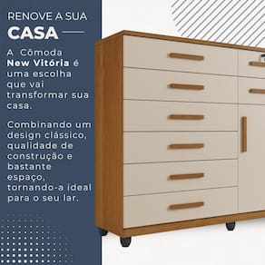 Procurando um movel pratico e funcional para o quarto? A Comoda Vitoria e excelente! Ela oferece conforto e comodidade. As oito gavetas contam com amplo espaco interno, alem de otima profundidade, deixando tudo mais organizado. Alem disso, possuem corredicas telescopicas e chave em uma das gavetas. Os puxadores sao madeirados, proporcionando um otimo acabamento ao movel. A estrutura do tampo em MDP 2,5 cm proporciona mais firmeza e durabilidade. E ideal para deixar o quarto mais pratico e bonito!