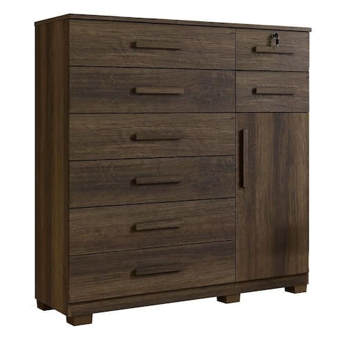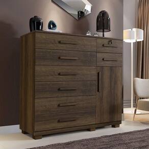 Cômoda New Vitoria 8 Gavetas Com Sapateira - Benetil Imbuia A Comoda New Vitoria complementa seu quarto com charme e sofisticacao, combinando praticidade e beleza. Com oito gavetas espacosas, sendo uma com chave para maior seguranca, oferece organizacao e seguranca para seus itens pessoais. Suas corredicas telescopicas proporcionam suavidade e resistencia no uso diario. Conta ainda com uma porta e prateleira interna, formando uma sapateira bem estruturada. Fabricada em chapa de 15 mm, garante durabilidade e robustez superiores. Com a tecnologia MDP Perfect, alia sustentabilidade e inovacao, proporcionando longa vida util e facil manutencao. A pintura UV de alta resistencia e facil de limpar e ecologicamente correta, feita com madeira de reflorestamento para uma escolha mais sustentavel. Caracteristicas: Material Principal: Mdp Espessura Da Chapa: 15 Mm Escala De Brilho: Semi Brilho Acabamento: Pintura UV Sistema De Montagem: Parafuso, Cavilha E Cantoneiras Metalicas Quantidade de Gavetas: 08 Quantidade de Portas: 01