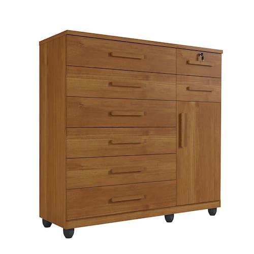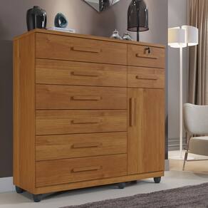 Procurando um móvel prático e funcional para o quarto? A Cômoda Vitória é excelente! Ela oferece conforto e comodidade. As oito gavetas contam com amplo espaço interno, além de ótima profundidade, deixando tudo mais organizado. Além disso, possuem corrediças telescópicas e chave em uma das gavetas. Os puxadores são madeirados, proporcionando um ótimo acabamento ao móvel. É ideal para deixar o quarto mais prático e bonito!