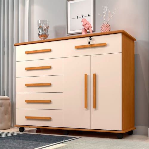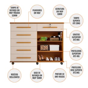 A Cômoda Sapateira Gran Luxo é uma ótima opção para organizar tudo o que você precisa. Possui 6 gavetas amplas e espaçosas e 2 portas, podendo acomodar sapatos e objetos.