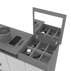 Conta com quatro amplas Gavetas, sendo uma com Fechadura, Porta Joias com Espelho Basculante e Colmeia, duas Portas e duas Prateleiras internas que podem ser utilizadas para acomodar roupas e calçados, tornando seu produto multiuso.