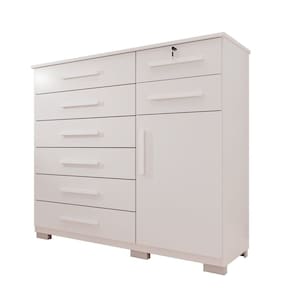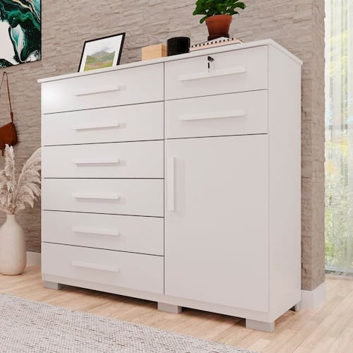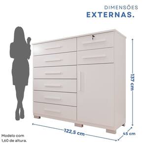 Cômoda com 1 porta e 8 gavetas, fabricada com estrutura de 15mm, garantindo resistência e durabilidade. Uma gaveta possui chave, proporcionando mais segurança para objetos pessoais. Seu design funcional oferece amplo espaço interno, facilitando a organização do dia a dia. Gavetas espaçosas permitem armazenar roupas, acessórios e diversos itens com praticidade. Perfeita para complementar qualquer ambiente com elegância e utilidade. Produto Montado: Sim Acabamento da Gaveta: Pintura UV Acabamento da Porta: Pintura UV Acabamento da Prateleira: Pintura UV Ambiente Principal: Quarto codigo_ean: 7900288106735 Complexidade da Montagem: Média: pode ser montado por mais de uma pessoa e/ou necessite de maior conhecimento para montagem Cor: Branco Cor do Produto: Branco Escala de Brilho: Fosco Escala de Brilho da Porta: Fosco Escala de Brilho da Prateleira: Fosco Gaveta com Chave: Sim Itens Inclusos: 1 Cômoda, Manual de Montagem e Kit Ferragens. Linha ou Coleção: Onix Manual de Montagem e Instalação: https://product-hub-prd.madeiramadeira.com.br/983719/documents/f340a976-c3f1-438b-a6ad-e458d37be1aa2775512493817435096802089.pdf Marca: Espresso Móveis Material da Gaveta: MDP Material da Porta: MDP Material da Prateleira: MDP Material do Fundo: mdf Material dos Pés: PVC Material Principal: MDP Necessita Montagem: Sim Origem do Produto: Nacional Peso: 71,7 kg Peso Máximo por Gaveta: 3 kg Peso Máximo por Prateleira: 5 kg Possui Espelho: Não Possui Nichos: Não Possui Pés: 06 Possui Portas: Sim Possui Prateleiras: Sim Possui Rodízio: Não Recomendações de Uso, Manutenção e Limpeza: Limpeza com pano macio e levemente umedecido. Não utilizar solventes a base e de inflamáveis. Não utilizar produtos abrasivos. Sapatas Niveladoras: Não Sistema de Montagem: Parafusos e cavilhas Suporta Até (kg): 29 kg Tipo de Corrediça da Gaveta: Metálica Telescópica Tipo de Dobradiça/Corrediça da Porta: Aço Tipo de Porta: Bater Tipo de Puxador da Gaveta: Externo Tipo de Puxador da Porta: Externo