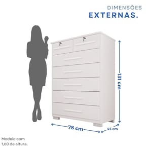 Cômoda com 7 gavetas, fabricada com estrutura de 15mm, garantindo resistência e durabilidade. Duas gavetas possuem chave, proporcionando mais segurança para objetos pessoais. Seu design funcional oferece amplo espaço interno, facilitando a organização do dia a dia. Gavetas espaçosas permitem armazenar roupas, acessórios e diversos itens com praticidade. Perfeita para complementar qualquer ambiente com elegância e utilidade. Produto Montado: Sim Acabamento da Gaveta: Pintura UV Ambiente Principal: Quarto codigo_ean: 7900288106902 Complexidade da Montagem: Média: pode ser montado por mais de uma pessoa e/ou necessite de maior conhecimento para montagem Cor: Branco Cor do Produto: Branco Escala de Brilho: Fosco Gaveta com Chave: Sim Itens Inclusos: 1 Cômoda, Manual de Montagem e Kit Ferragens. Linha ou Coleção: Topázio Manual de Montagem e Instalação: https://product-hub-prd.madeiramadeira.com.br/983734/documents/2f211769-213e-445f-bf8a-91720dbcff742775654493817435115460433.pdf Marca: Espresso Móveis Material da Gaveta: MDP Material do Fundo: mdf Material dos Pés: PVC Material Principal: MDP Necessita Montagem: Sim Origem do Produto: Nacional Peso: 47,7 kg Peso Máximo por Gaveta: 3 kg Possui Espelho: Não Possui Nichos: Não Possui Pés: 04 Possui Portas: Não Possui Prateleiras: Não Possui Rodízio: Não Recomendações de Uso, Manutenção e Limpeza: Limpeza com pano macio e levemente umedecido. Não utilizar solventes a base e de inflamáveis. Não utilizar produtos abrasivos. Sapatas Niveladoras: Não Sistema de Montagem: Parafusos e cavilhas Suporta Até (kg): 21 kg Tipo de Corrediça da Gaveta: Metálica Telescópica Tipo de Puxador da Gaveta: Externo