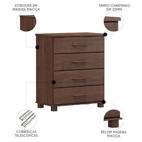 As quatro gavetas, com puxadores em madeira e equipadas com corrediças telescópicas, deslizam suavemente, oferecendo resistência e conforto no uso. O design dos puxadores realça a beleza natural da Cômoda de Casal, deixando-a ainda mais elegante.