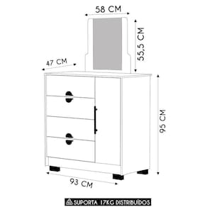 Com quatro gavetas equipadas com corrediças metálicas e uma porta lateral com prateleira móvel, a Cômoda Para Quarto oferece versatilidade e praticidade. Ela permite uma organização eficiente de diversos itens, mantendo o ambiente sempre arrumado e acessível. A estrutura foi projetada para garantir funcionalidade sem abrir mão do estilo.