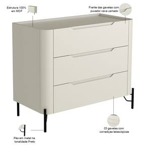 Combinando design orgânico e industrial, essa cômoda moderna traz linhas curvas e pés metálicos, criando um visual único e elegante. Já os puxadores cava garantem um visual clean e contemporâneo, ideal para quartos e closets. Para completar, essa cômoda conta com estrutura robusta, uma vez que é fabricada em 100% MDF, de modo a oferecer durabilidade e resistência, mantendo o charme do seu ambiente por muito mais tempo, enquanto as amplas gavetas dispõem de espaço dinâmico para manter tudo no lugar.