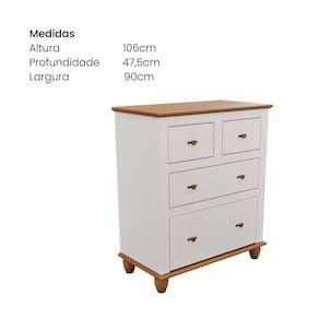 Esta incrível peça combina de maneira impecável funcionalidade, sustentabilidade e estética requintada. Começando pelo de madeira maciça de reflorestamento com 2,5cm de espessura nos tampos e bases, não apenas garantimos durabilidade e robustez, mas também demonstramos nosso compromisso inabalável com a sustentabilidade ambiental. O destaque dessa peça está no seu acabamento em laca e nos detalhes em baixo relevo, adicionando uma camada adicional de sofisticação ao seu design. A utilização de pintura atóxica assegura a segurança dos usuários, ao mesmo tempo em que preserva a elegância do móvel. Os puxadores e dobradiças com textura em ouro envelhecido são um tributo ao charme vintage, elevando o estilo retrô a um patamar supeior. Produto Montado: Sim Acabamento da Gaveta: Pintura UV Acabamento dos Pés: Pintura Altura dos Pés: 10,5 cm Altura Máxima dos Pés: 10.5000 Ambiente Principal: Quarto de Bebê codigo_ean: 7900288214034 Complexidade da Montagem: Média: pode ser montado por mais de uma pessoa e/ou necessite de maior conhecimento para montagem Cor: Off White/Nogueira Cor do Produto: Off White/Nogueira Escala de Brilho: Semi-Brilho Escala de Brilho da Gaveta: Semi-Brilho Gaveta com Chave: Não Itens Inclusos: 1 Cômoda, Kit Ferragens e Manual de Montagem Linha ou Coleção: Joy Manual de Montagem e Instalação: https://product-hub-prd.madeiramadeira.com.br/174516855/documents/6498a6d6-cbe2-4aba-84f7-10e9250a639cbc14c05131179b6b1755285472.pdf Marca: Móveis Serpil Material da Gaveta: MDF Material do Fundo: MDF Material do Puxador da Gaveta: Metal Material dos Pés: Madeira Maciça Material Principal: MDF modular: Não Necessita Montagem: Sim Origem do Produto: Nacional Pés Reguláveis: Não Peso: 47,5 kg Peso Máximo por Gaveta: 4 kg Possui Espelho: Não Possui Nichos: Não Possui Pés: 04 Possui Portas: Não Possui Prateleiras: Não Possui Rodízio: Não Possui Trocador: Não Quantidade de Gavetas: 04 Gavetas Recomendações de Uso, Manutenção e Limpeza: Use um pano macio levemente umedecido. Não utilizar produtos abrasivos. Sapatas Niveladoras: Não Sistema de Montagem: Cavilhas, parafusos e minifix. Suporta Até (kg): 30 kg Tipo de Cômoda: Bebê Tipo de Corrediça da Gaveta: Metálica Telescópica Tipo de Madeira Maciça dos Pés: Pinus Tipo de Puxador da Gaveta: Externo