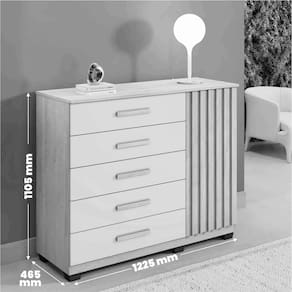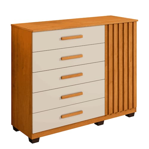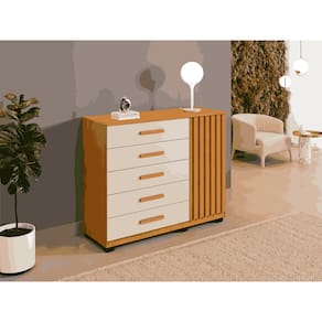 Cômoda Paris 5 gavetas com Sapateira A CÔMODA PARIS É PRODUZIDA EM CHAPA DE 15 MM QUE GARANTE ROBUSTES E MAIOR VIDA ÚTIL , CONTEM 1 PORTA RIPADA , 2 PRATELEIRAS, 5 GAVETAS GRANDES,COM CORREDIÇAS TELESCOPICA, PES INCLUSO NO PRODUTO E PUXADORES NA COR , ÓTIMO CUSTO BENEFICIO, ALEM DA ESTETICA SER LINDISSIMA. Medidas do Produto Montado: Altura: 110,5cmLargura: 122,5cmProfundidade: 46,5cm Características: - Produto em 15mm MDP- Cores Disponíveis: Branco com Cinamomo, Cinamomo e Cinamomo com Off White- 1 Porta Ripada- 2 Prateleiras- 5 gavetas- Gavetas com Corrediças Telescópicas- Puxadores em Amadeirados- Pés Incluso- Grande espaço interno- Puxadores: PVC- Acabamento: Pintura UV- Recomendações de manutenção: Limpeza com pano umedecido. Não aplicar lustra móveis.- Complexidade da montagem: Difícil, precisa de um profissional para montagem. - Marca: Benetil ?