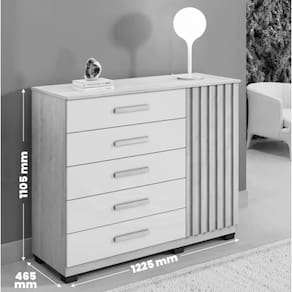 Características: - Produto em 15mm MDP - Cores Disponíveis: Branco com Cinamomo, Cinamomo e Cinamomo com Off White - 1 Porta Ripada - 2 Prateleiras - 5 gavetas - Gavetas com Corrediças Telescópicas - Puxadores em Amadeirados - Pés Incluso - Grande espaço interno - Puxadores: PVC - Acabamento: Pintura UV - Recomendações de manutenção: Limpeza com pano umedecido. Não aplicar lustra móveis.