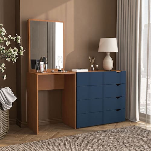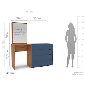 A Cômoda Penteadeira com Espelho Porto da Politorno Móveis é a escolha perfeita para quem busca elegância, funcionalidade e otimização de espaço em um único móvel. Com design moderno e sofisticado na cor azul e freijó, ela combina a praticidade de uma cômoda com a utilidade de uma penteadeira, ideal para quartos que exigem versatilidade sem abrir mão do estilo. Com 149 cm de largura, 160 cm de altura e 46 cm de profundidade, oferece amplo espaço com 4 gavetas funcionais, um tampo generoso para itens de uso diário e um espelho grande que valoriza ainda mais o ambiente. Fabricada em MDP com acabamento em pintura UV semi fosco, é resistente, durável e fácil de limpar, trazendo beleza e praticidade para sua rotina com o padrão de qualidade da Linha Porto da Politorno. Produto Montado: Sim Acabamento da Gaveta: Pintura UV Altura do Espelho: 71 cm Ambiente Principal: Quarto codigo_ean: 7900288187666 Complexidade da Montagem: Média: pode ser montado por mais de uma pessoa e/ou necessite de maior conhecimento para montagem Cor: Freijó/Azul Cor do Produto: Freijó/Azul Cor Interna: Freijó Escala de Brilho: Semi-Fosco Espessura do Espelho: 3 mm Fita Integrada: Sim Formato do Espelho: Retangular Gaveta com Chave: Não Itens Inclusos: 1 Cômoda, Kit Ferragem, Manual de Montagem e Termo de Garantia Largura do Espelho: 53 cm Linha ou Coleção: Porto Manual de Montagem e Instalação: https://product-hub-prd.madeiramadeira.com.br/767998352/documents/7b94134d-0643-4dad-b315-2a2624473c053049146622417515664632978.pdf Marca: Politorno Material da Gaveta: MDF/MDP Material do Fundo: MDP Material Principal: MDP Necessita Montagem: Sim Origem do Produto: Nacional Peso: 32 kg Peso Máximo por Gaveta: 5 kg Possui Espelho: Sim Possui Nichos: Não Possui Pés: Não Possui Portas: Não Possui Prateleiras: Não Quantidade de Espelho: 01 Quantidade de Gavetas: 04 Gavetas Recomendações de Uso, Manutenção e Limpeza: Utilize um pano macio umedecido com água e sabão neutro, seguido de pano seco. Não utilize produtos químicos ou abrasivos para limpeza, pois estes danificam o revestimento do móvel. Sapatas Niveladoras: Não Sistema de Montagem: Cavilha, Parafuso, Minifix e prego. Suporta Até (kg): 15 kg Tipo de Cômoda: Adulto Tipo de Corrediça da Gaveta: Metálica Telescópica Tipo de Fixação do Espelho: Fita Dupla Face Tipo de Puxador da Gaveta: Embutido Marca: Não Informado